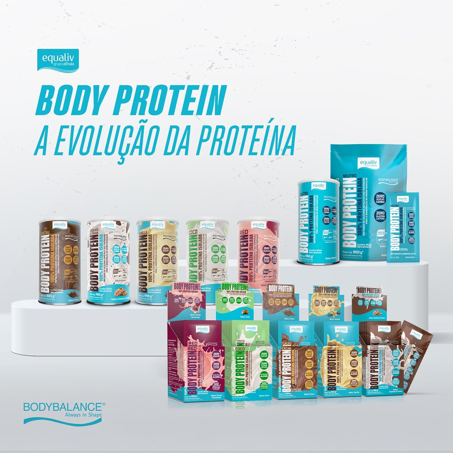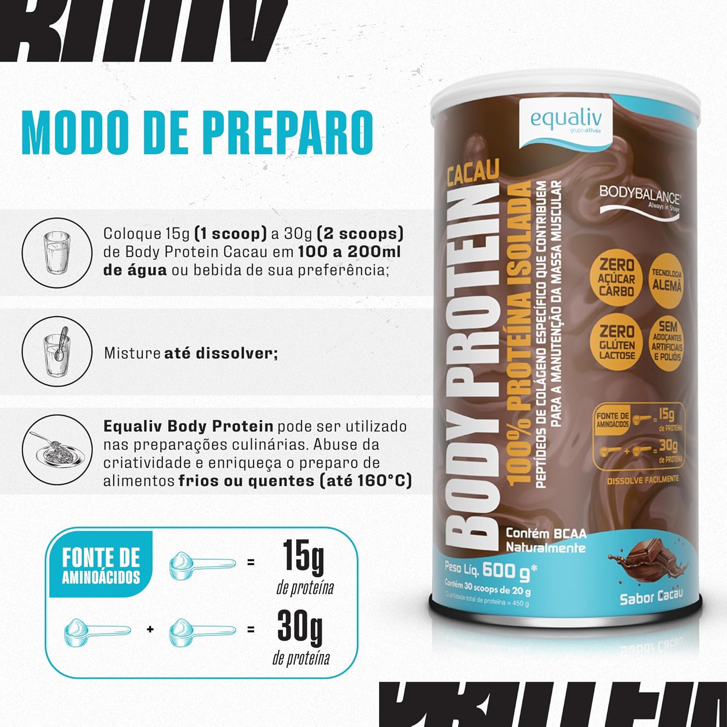 Body Protein (600g) A PROTEÍNA MAIS TECNOLÓGICA DO MERCADO! Equaliv Body Protein é uma proteína isolada e hidrolisada à base de peptídeos de colágeno, com a tecnologia inovadora alemã BODYBALANCE, trata-se de uma proteína isolada à base de peptídeos de colágeno que contribui para o aumento da massa muscular, emagrecimento, aumento da força e recuperação pós-treino. PROTEÍNA NÃO É TUDO IGUAL! Body Protein não é proveniente do soro do leite, sendo assim, pode ser consumido tranquilamente por todos aqueles intolerantes à lactose. Outro diferencial é a presença de aminoácidos de cadeia ramificada (BCAA), a leucina, isoleucina e valina, os quais correspondem a cerca de 35% dos aminoácidos essenciais em proteínas musculares. Benefícios: – Zero açúcar, Zero Glúten e Zero Lactose;- Tecnologia Alemã;- Sem adoçantes artificiais e Polióis.
