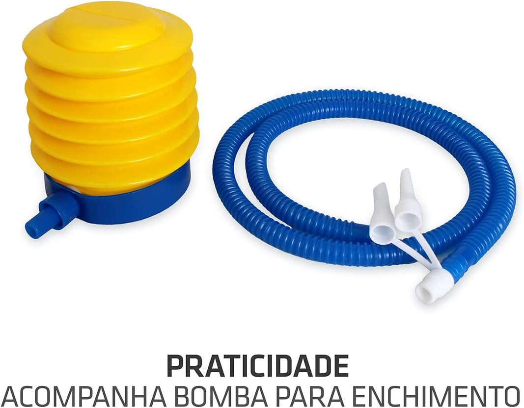 A bola acompanha uma bomba para que ela seja inflada. É de fácil utilização e, por essa questão, também permite que seja esvaziada a qualquer momento caso seja necessário guardar em lugares menos espaçosos. Desenvolvida em PVC, possui superfície emborrachada para promover melhor aderência ao solo e também é de fácil limpeza.