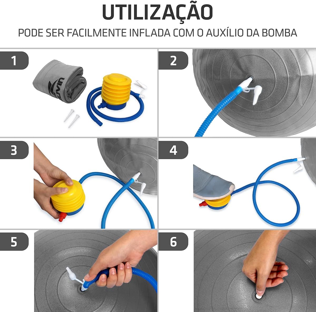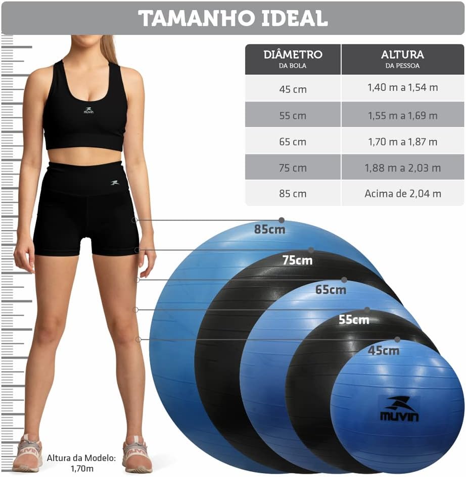 ACOMPANHA BOMBA: A Bola de Pilates da Muvin acompanha uma bomba para que ela seja inflada. É de fácil utilização e, por essa questão, também permite que seja esvaziada a qualquer momento caso seja necessário guardar em lugares menos espaçosos