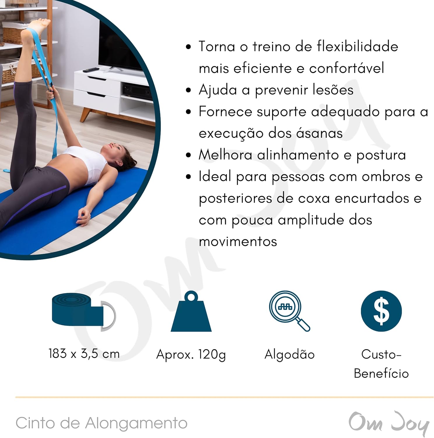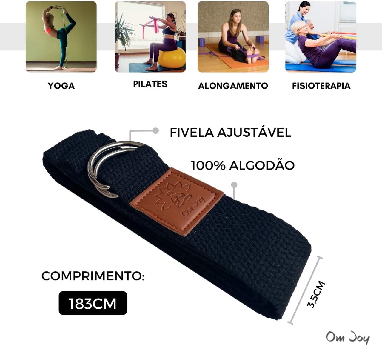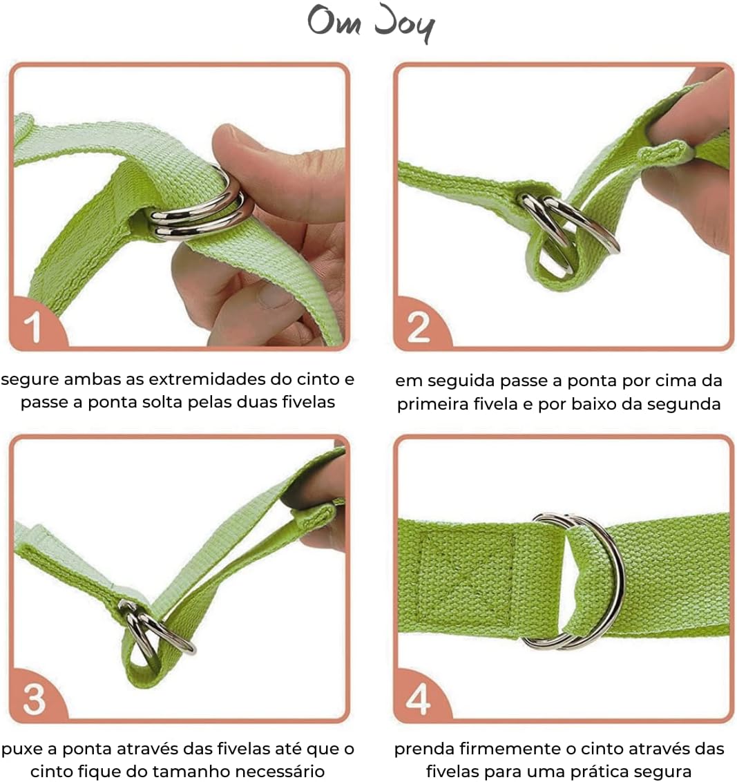 DIMENSÕES: 183 x 3,5cm | 120g; COMPOSIÇÃO: 100% algodão; Comprimento ajustável através da fivela deslizante; Excelente acessório para auxiliar movimentos de alongamento e tração em práticas de Yoga, Pilates e exercícios funcionais;