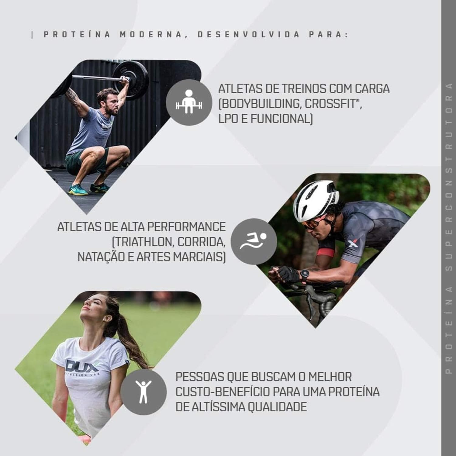 O Whey Protein Concentrado Dux Nutrition é composto por proteínas de alto valor biológico e rápida absorção, além de gorduras essenciais, carboidratos e uma ampla gama de aminoácidos, fundamentais para garantir a síntese muscular acelerada após a prática de esportes. É ideal para ser consumido antes e depois de treinos, mas também pode fazer parte do café da manhã ou servir como um lanche entre as refeições, e em outros momentos conforme a orientação do seu nutricionista. Se há um nutriente indispensável, é a proteína. Ela é feita de aminoácidos, que são os blocos de construção do nosso corpo. A proteína do soro do leite, em inglês “Whey Protein”, é uma das fontes de aminoácidos de melhor absorção, maior até que o frango ou peixe. Isso torna o Whey uma forma conveniente de ingerir proteína, melhorando a saúde, o bem-estar e os resultados dos treinos. BENEFÍCIOS: > Não contém goma xantana, complexos vitamínicos à base de maltodextrina, espessantes, estabilizantes, conservantes ou qualquer outro ingrediente inferior; > Contém corantes 100% naturais, sem ingredientes artificiais; > O nome diz tudo: Whey Protein Concentrado 100% puro, com transparência total, do nome do produto à lista de ingredientes; > Matéria-prima premium importada, com alto teor de leucina, desenvolvida para criar um produto com sabor real e marcante; > Valores nutricionais robustos, sem excessos, com quantidades ideais de carboidratos e gorduras do leite; > Perfil de aminoácidos imbatível: 5g de BCAAs, 4,3g de glutamina e 2,5g de leucina, por dose; > 20g de proteína; > Não contém goma xantana, complexos vitamínicos à base de maltodextrina, espessantes, estabilizantes, conservantes ou qualquer outro ingrediente inferior; > Contém corantes 100% naturais, sem ingredientes artificiais; > Proteína moderna, desenvolvida por especialistas para atletas de esportes de performance (bodybuilding, crossfit e artes marciais), pessoas que buscam uma proteína com baixa caloria (para snacks fit e receitas sem culpa) e pessoas que buscam uma proteína ultrapura de altíssima qualidade.