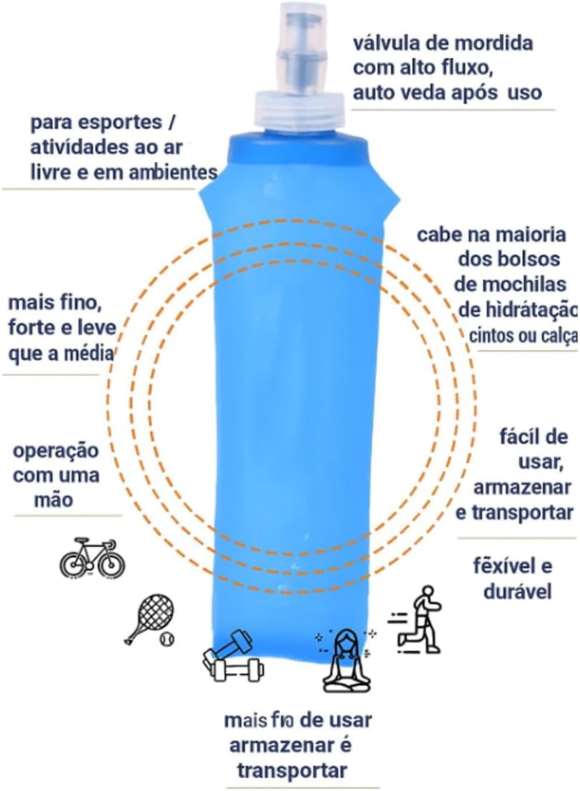 Descubra a praticidade e versatilidade desta garrafa dobrável de silicone soft com capacidade de 500ml. Perfeita para suas atividades esportivas, seja corrida, ciclismo ou qualquer outro esporte. O design inovador permite dobrar a garrafa quando vazia, economizando espaço em sua mochila ou bolsa. Equipada com bico antivazamento, garante que você não terá preocupações com derramamentos indesejados durante suas atividades. A garrafa é reutilizável e disponível em cores sortidas (azul ou preto), combinando funcionalidade com estilo. O material macio de silicone oferece ótima pegada e durabilidade. Com capacidade de 500ml, fornece hidratação adequada durante seus treinos e atividades físicas. Ideal para atletas, entusiastas de esportes ou qualquer pessoa que busque uma solução prática para se manter hidratado em movimento.