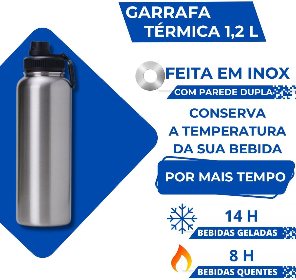 NOUFEX-Garrafa Térmica Inox 1,2 Litros Squeeze Academia Água Gelada Parede Dupla e Isolamento a Vácuo, Ideal Para a Prática de Atividades Físicas, Com Tampa de Silicone Antivazamento e Design Moderno e Funcional Garrafa térmica feita em inox com parede dupla livre de BPA, capacidade de 1,2 litros. Tampa com alça para transporte e tampa de proteção para o bocal. Transforme sua rotina de hidratação com a Garrafa Térmica Inox 1,2 Litros, a companheira perfeita para seus treinos e aventuras diárias. Leve suas bebidas geladas por horas, mantendo a temperatura ideal em qualquer atividade ao ar livre. Seu design moderno não compromete a funcionalidade, garantindo durabilidade e praticidade. Nossa Garrafa Térmica Inox está voando das prateleiras. Garanta a sua antes que acabe e fique sem esse aliado indispensável para seus exercícios e viagens. Vedação Perfeita: Com uma tampa de vedação segura, você pode le sua garrafa na mochila sem se preocupar com vazamentos, garantindo uma experiência sem preocupações. Conveniência e Versatilidade: Perfeita para academia, caminhadas, acampamentos e viagens, mantendo suas bebidas frescas e prontas para consumo a qualquer momento. Resistência e Qualidade: Feita para durar, nossa garrafa térmica é resistente a impactos e projetada para uso intenso, seja na cidade ou na natureza. Design Ergonômico: Fácil de segurar e transportar, proporcionando conforto durante o uso. Sustentabilidade: Fabricada com materiais que respeitam o meio ambiente, contribuindo para um estilo de vida mais sustentável. Estilo e Elegância: Seu design sofisticado combina com qualquer ambiente, do escritório à trilha ao ar livre. Não perca tempo – descubra agora por que você precisa da Garrafa Térmica Inox 1,2 Litros em sua vida!