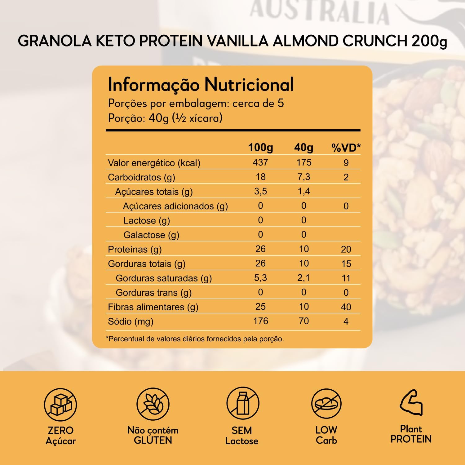 A Granola Australia Keto PROTEIN Vanilla Almond Crunch tem toda crocância da nossa linha de granolas LOW CARB, ZERO AÇÚCAR e com 26g de PROTEÍNA por porção. Irresistivelmente crocantes, feitas com proteína à base de plantas, a Granola Australia Keto Protein VANILLA ALMOND CRUNCH tem o delicioso sabor da baunilha, com amêndoas e castanhas. É docinha e saudável, perfeita para acompanhar iogurtes ou frutas.
