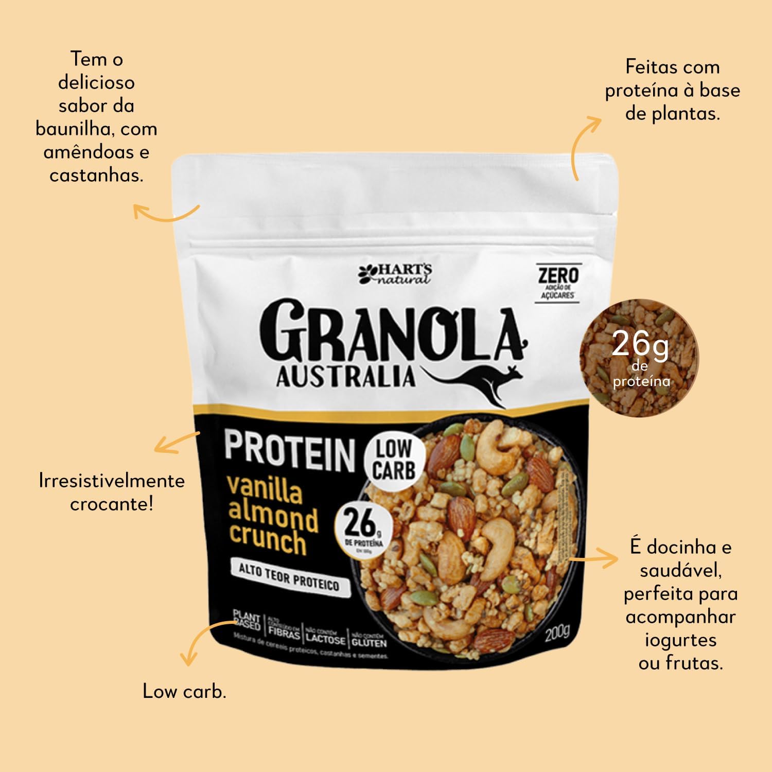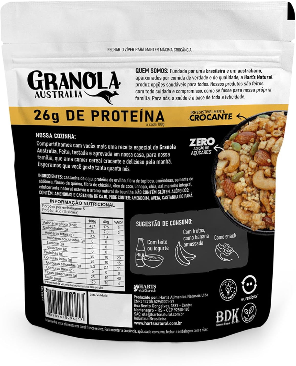 Versátil e prática, pode ser consumida com leite, iogurte, frutas ou como um snack proteico. Certificada Kosher, sem glúten e alto em fibras, é uma opção segura e deliciosa para diversas dietas e preferências alimentares, garantindo qualidade e sabor.