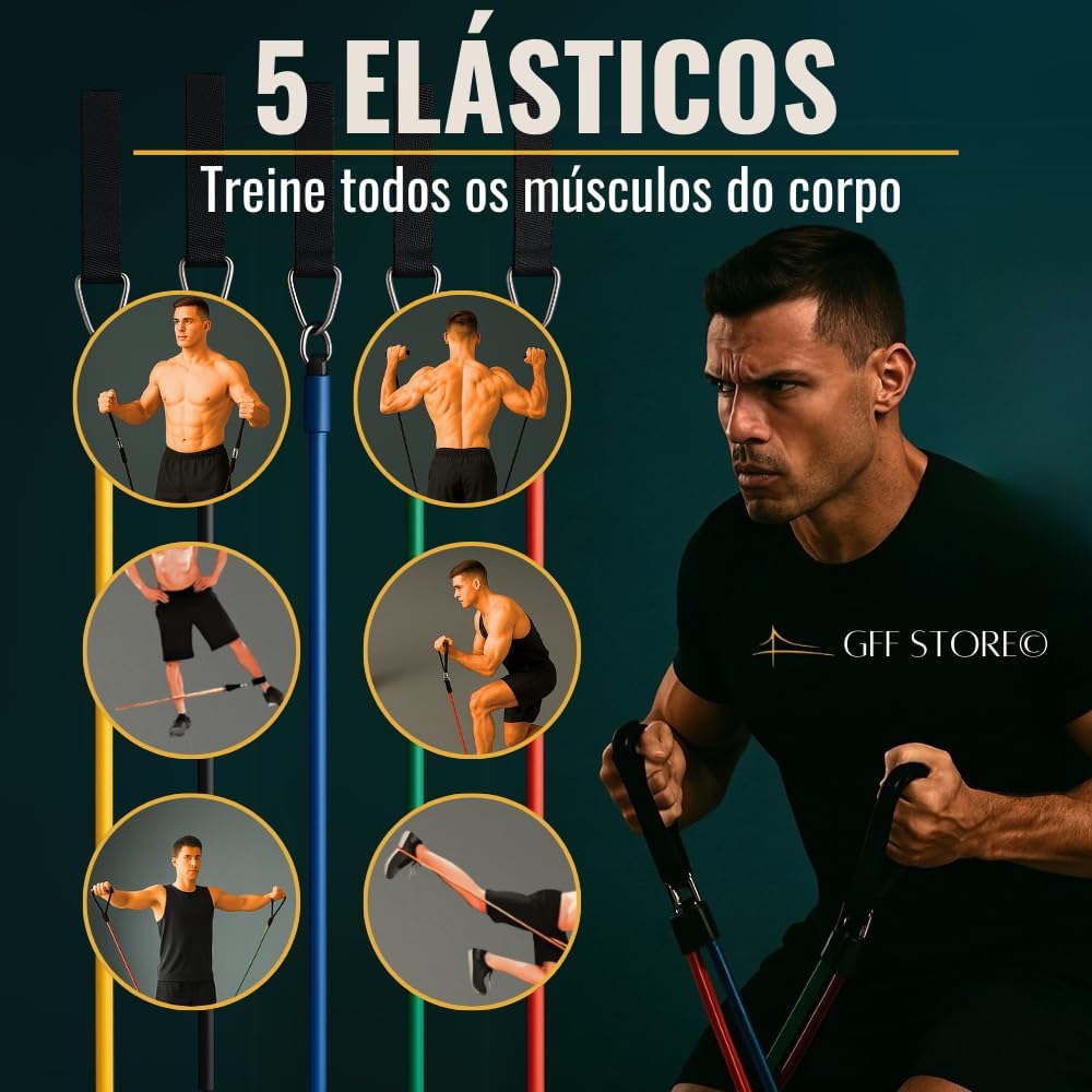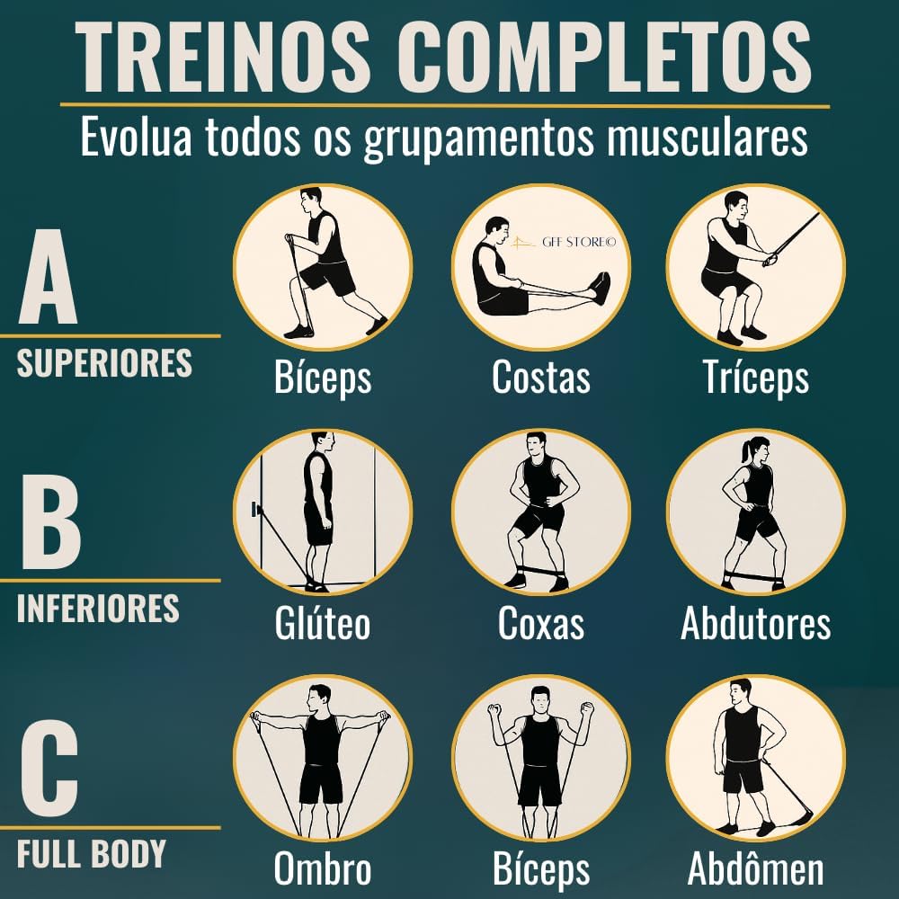 Treino Completo: Como mostram as imagens do anúncio, você pode treinar seus braços, peito, pernas, abdômen, glúteos e ombros com o nosso Kit de elásticos, desenvolvendo seu físico por completo sem precisar sair de casa ou frequentar uma academia