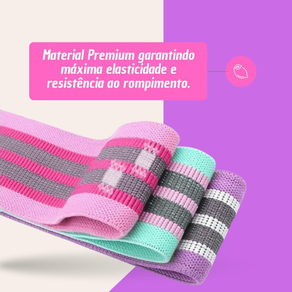Cada faixa é feita com tecido elástico resistente, macio e antiderrapante — ou seja, nada de escorregões, marcas na pele ou ajustes no meio do treino.