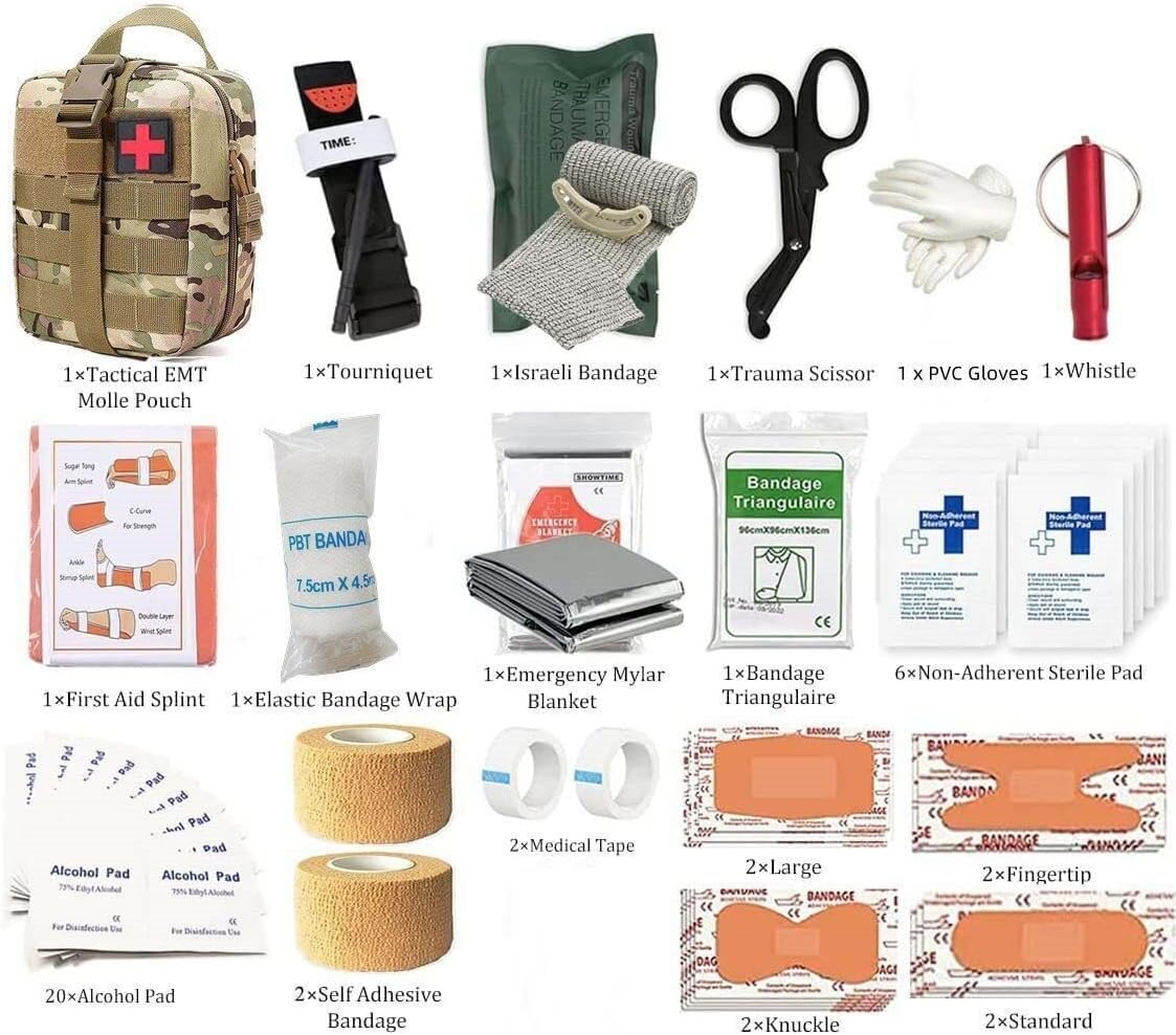 ❤Portátil”: kit de emergência compacto com muitas coisas. O kit contém os suprimentos de sobrevivência e primeiros socorros mais fáceis de usar, compactos e populares mais comumente usados no mercado para controlar sangramentos maiores, incluindo: torniquetes de combate militar, curativos de pressão tática e gaze comprimida