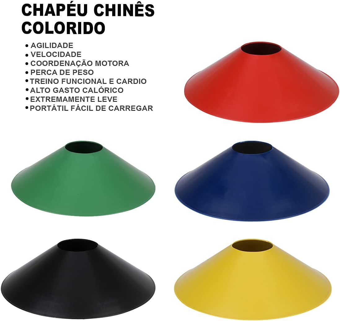 indicado para todas as modalidades esportivas. Acessórios para demarcação de espaços e oferece regularidade nos exercícios. CONE DEMARCATÓRIO: Material: Plástico injetado – Dimensões: 11cm largura x 18cm altura. CHAPÉU CHINÊS: Material: Plástico injetado – Dimensões: 19cm largura x 4,5cm altura.VANTAGENS: – Não desgasta com o tempo de uso – Super Leve. – Material Resistente. – Original e Qualidade. – Fácil de Higienizar. – Praticidade na armazenagem e transporte – Permite criar diversos percursos – Melhora condicionamento físico e ajuda perca peso. CORDA DE PULAR CROSSFIT:Comprimento: 2,70m – Composição: Corda em Pvc / Pegador em Polipropileno. ESCADA DE AGILIDADE: 6 degraus reforçados e ajustáveis. A distância entre os degraus é ajustável, adequando-se aos mais iados exercícios e treinamentos esportivos; – Tamanho total da escada é de 2,40 metros de comprimento x 0,50cm largura. – Dobrável, facilita na montagem/desmontagem e transporte. – Degraus especialmente fabricados em EVA 5mm espessura super resistentes para maior estabilidade. Aplicação do produto: Treinamento Funcional, Academia, Malhar em Casa, Futebol, Basquete, Badminton, Bola de rúgbi, Treinamento de atletismo, Treinamento de Agilidade, Etc. LIMPEZA E CONSERVAÇÃO: Limpe apenas com pano úmido e sabão neutro . Não seque ao sol ou secadores elétricos. Guardar fora do alcance do sol. Não pisar. Não Jogar. Seguindo essas instruções, você terá seu produto por muito mais tempo. Qualquer dúvida estamos à disposição!