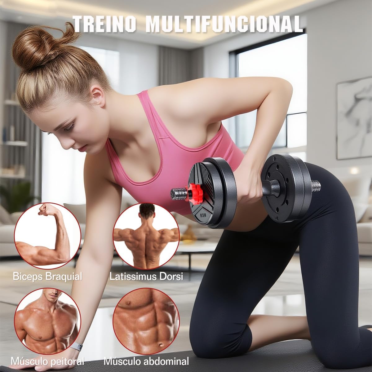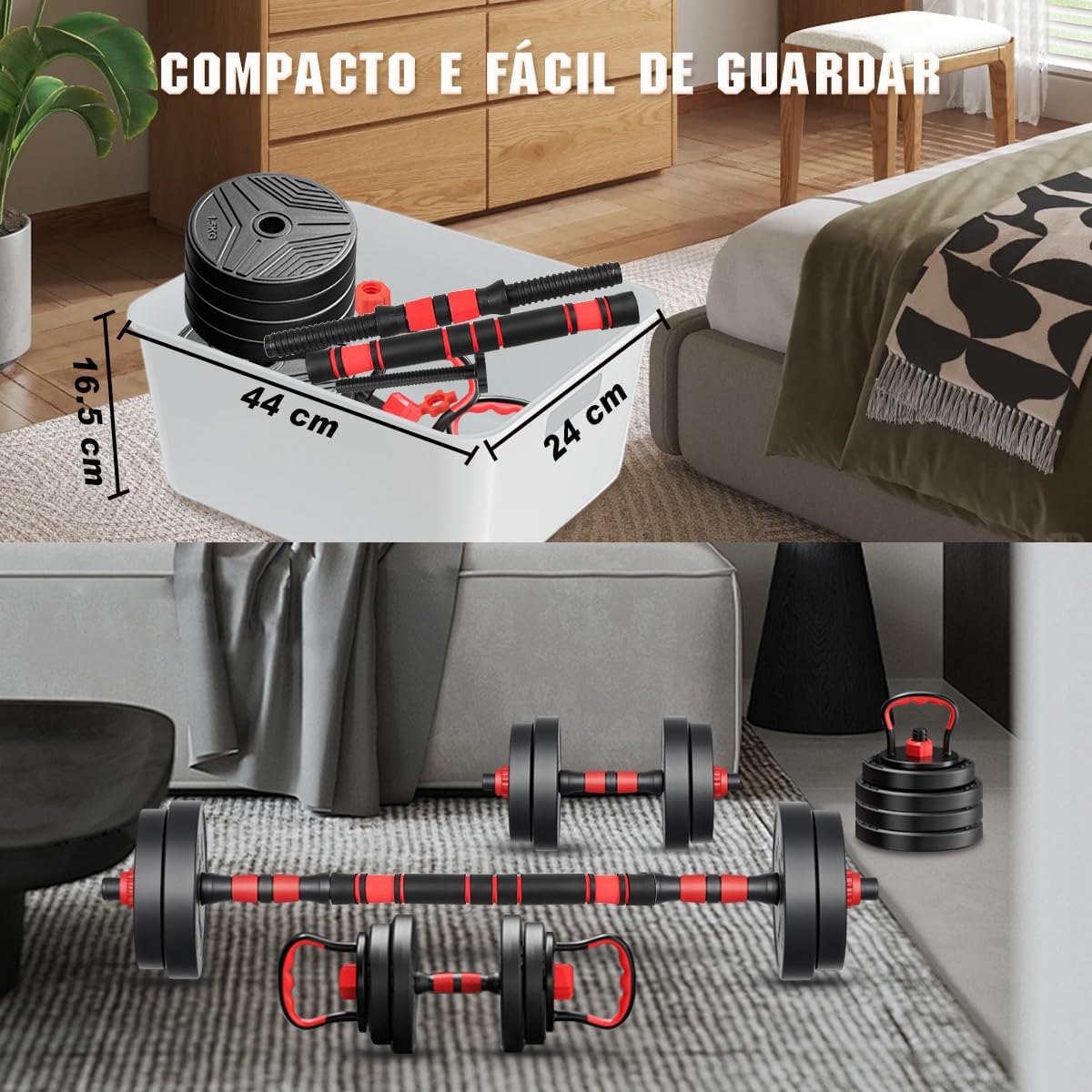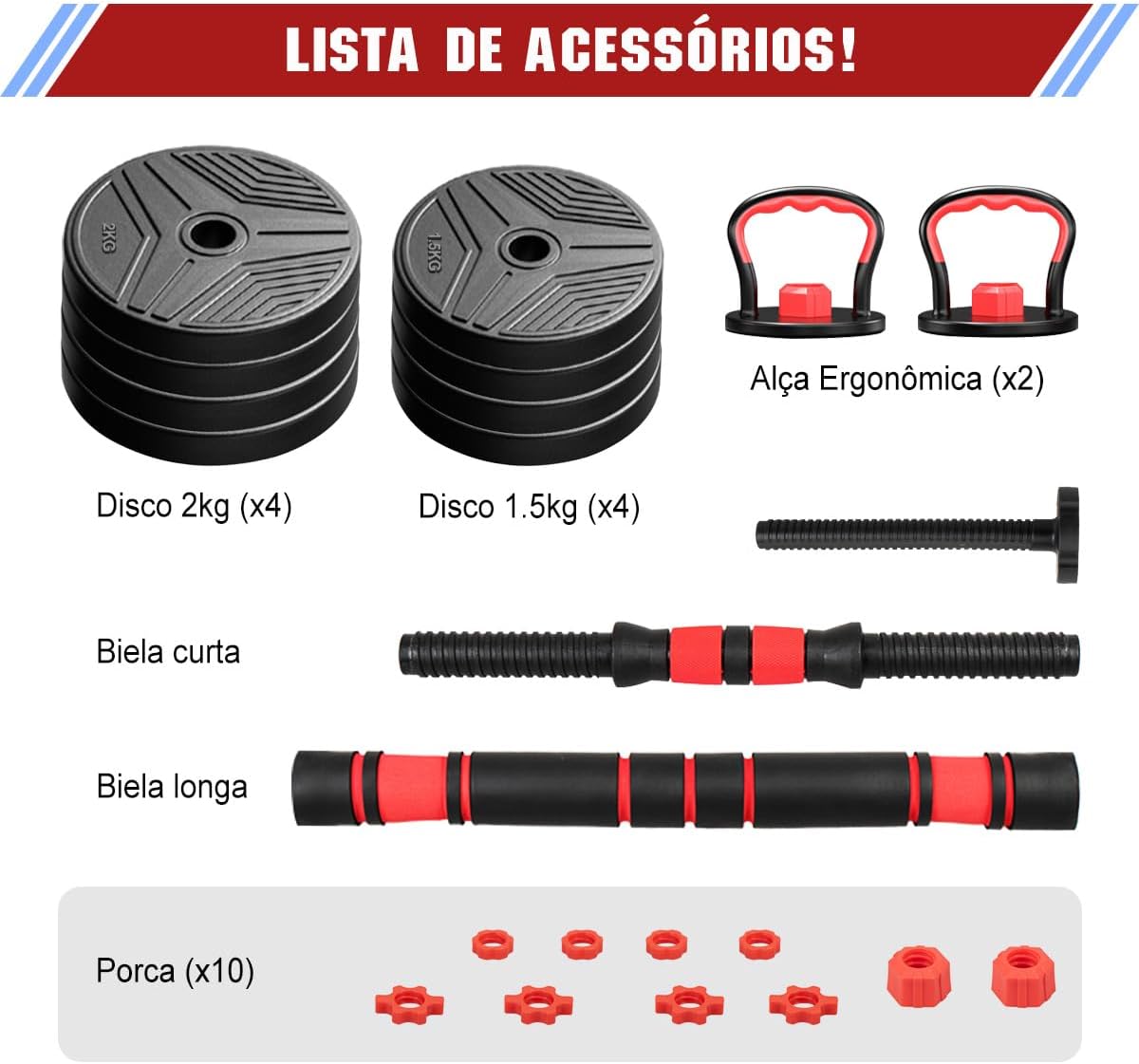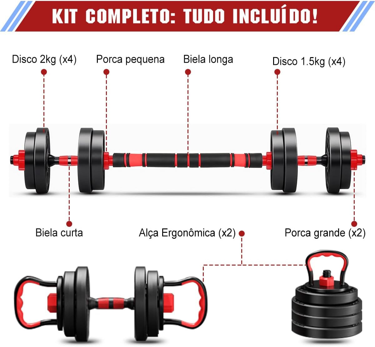 FÁCIL DE MONTAR – Inclui 8 porcas, 1 haste para kettlebell, 2 alças, 4 discos de 1,5kg, 4 discos de 2kg, 2 hastes de 35cm e 1 barra de 40cm. Simples de montar e ajustar.