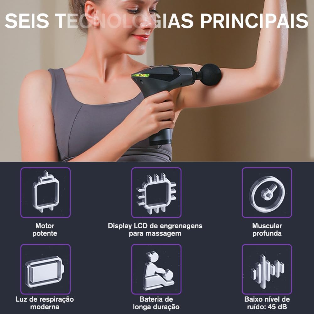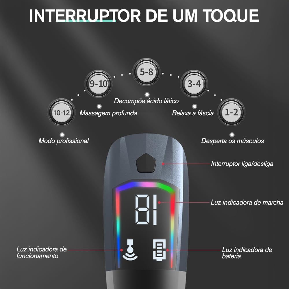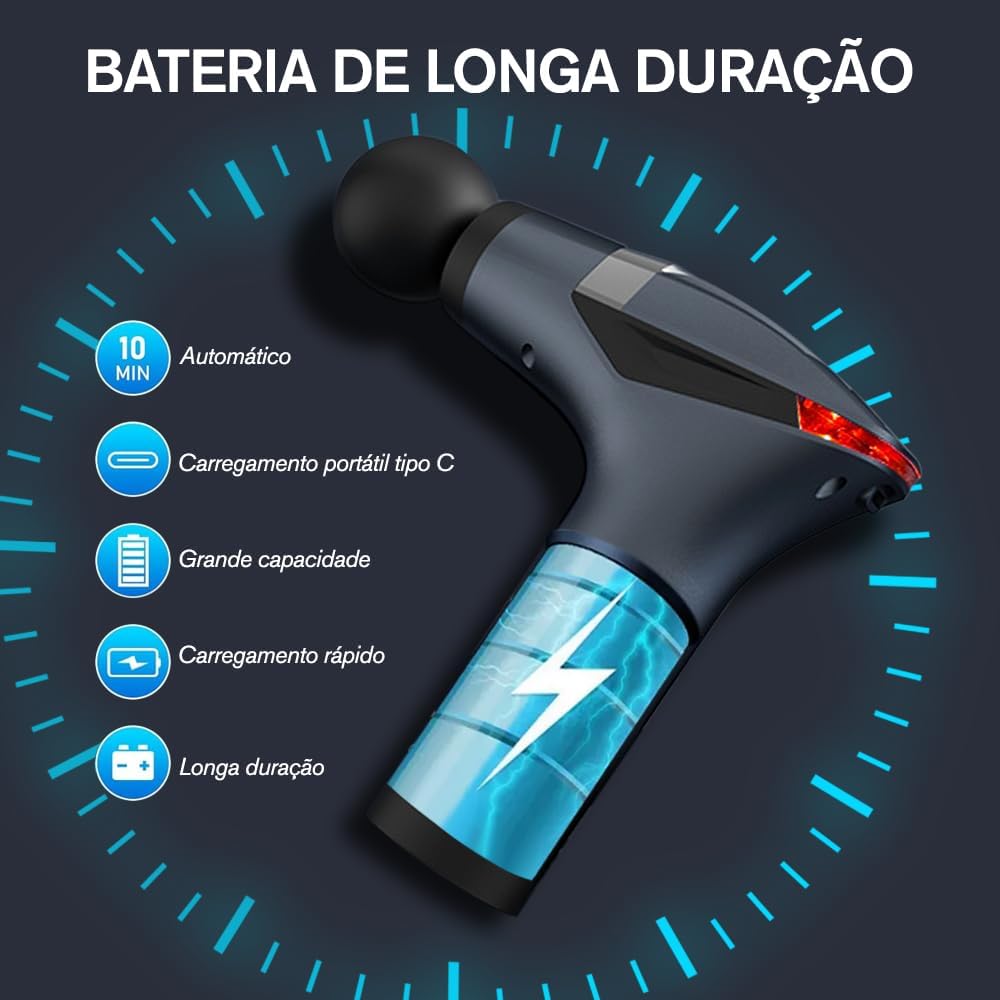 BATERIA DE LONGA DURAÇÃO DE 1500 MAH + PROTEÇÃO INTELIGENTE:A pistola de massagem suporta carregamento rápido USB-C e possui proteção de desligamento automático após 10 minutos para evitar o uso excessivo. Seu motor sem escovas é mais silencioso que 45 dB, tornando-a adequada para uso em escritórios, academias e outros ambientes sem causar desconforto.