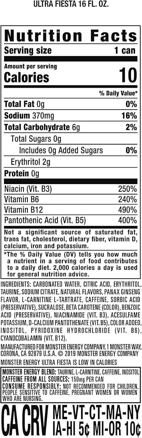 SABOR COMPLETO, ZERO AÇÚCAR Monster Energy Ultra Fiesta Mango tem 10 calorias e zero açúcar, mas com todo o sabor que você está acostumado e embalado com nossa mistura Monster Energy sem açúcar