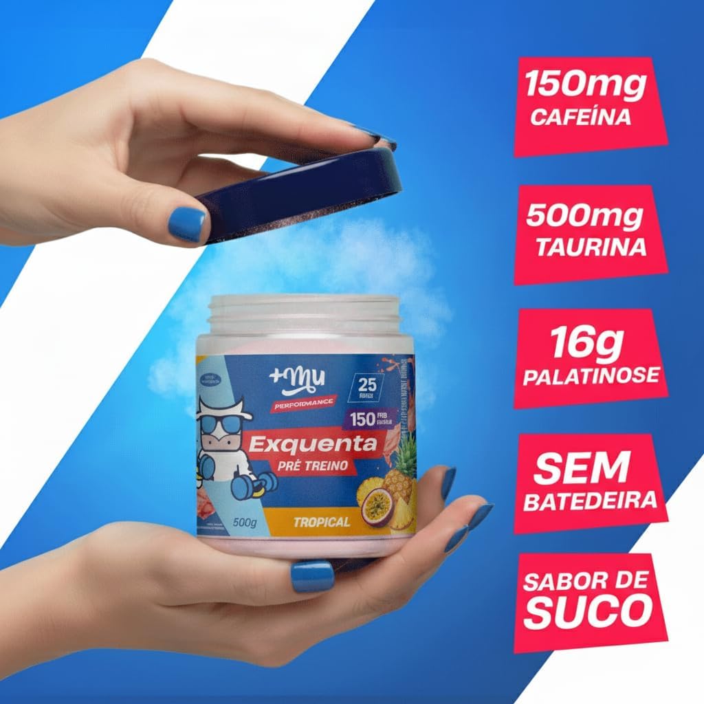 Pré treino com ingredientes naturais, que não te dá efeitos colaterais negativos. O Exquenta é o nosso pré treino da linha +Mu Performance! Ele contém ingredientes selecionados carinhosamente para dar uma acelerada no seu metabolismo, tirar aquela sensação de fadiga e então te ajudar a ter um melhor rendimento na atividade física!