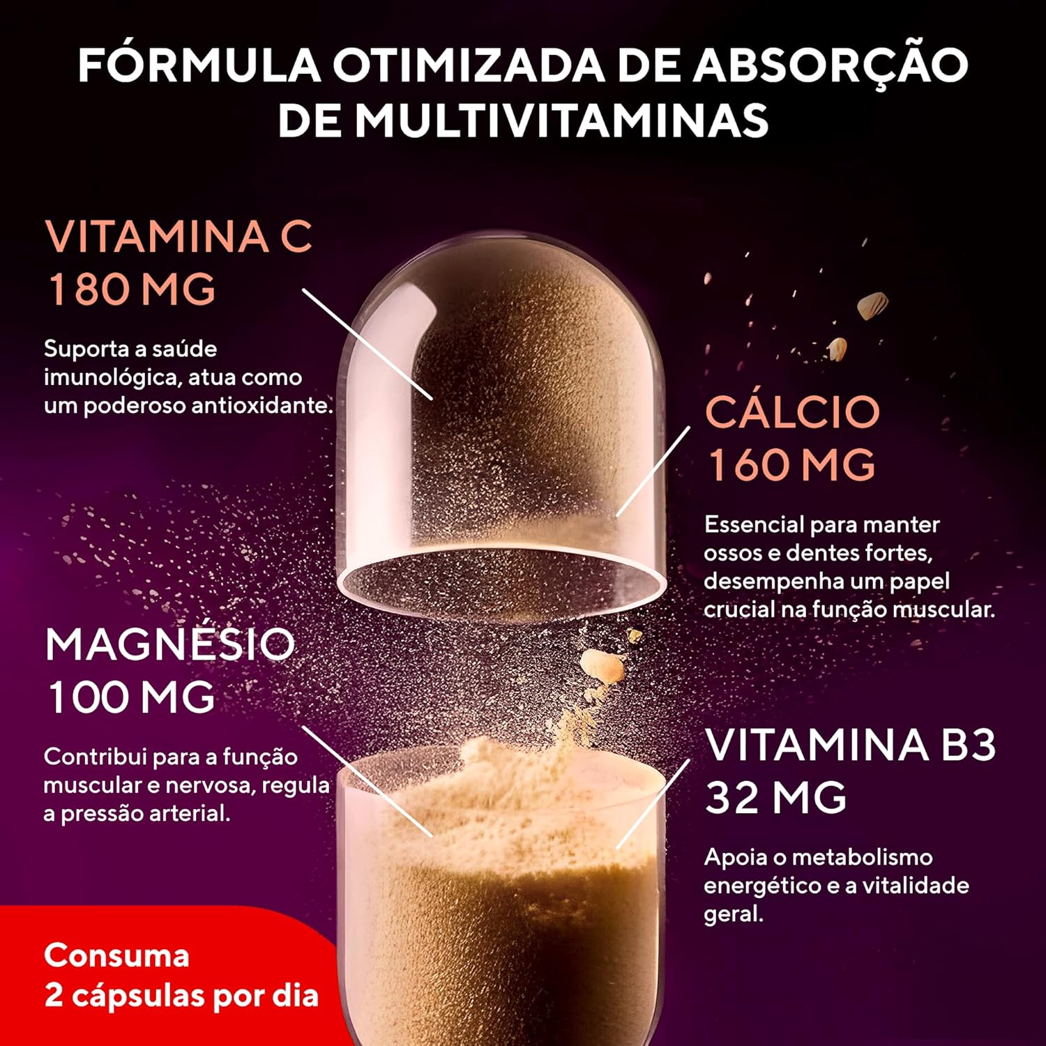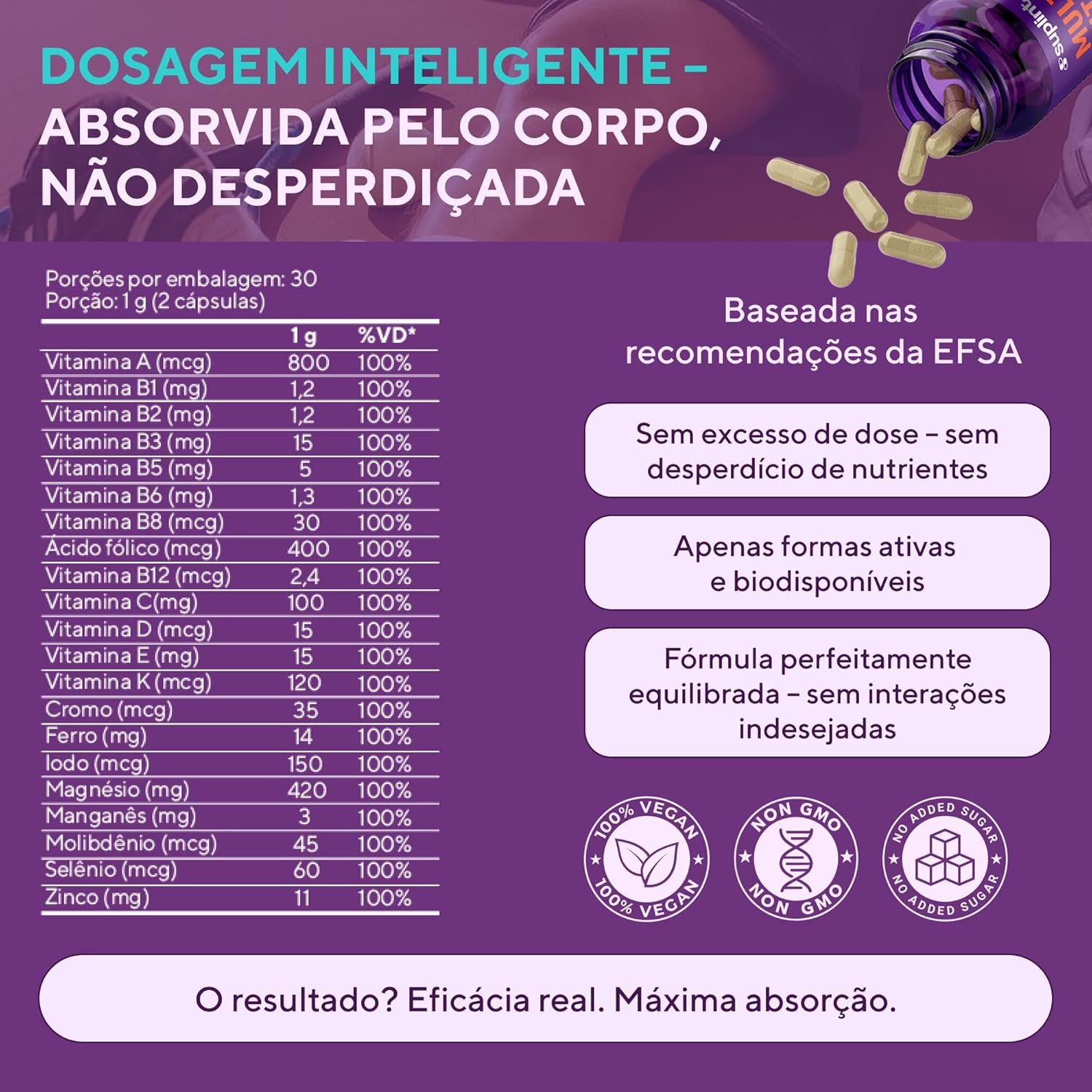 ✔ FÓRMULA MULTIVITAMÍNICA COMPLETA – Cada cápsula contém uma combinação de 21 ingredientes, incluindo vitaminas e minerais como A, C, D3, E, K1, Complexo B, Zinco e Cromo.
