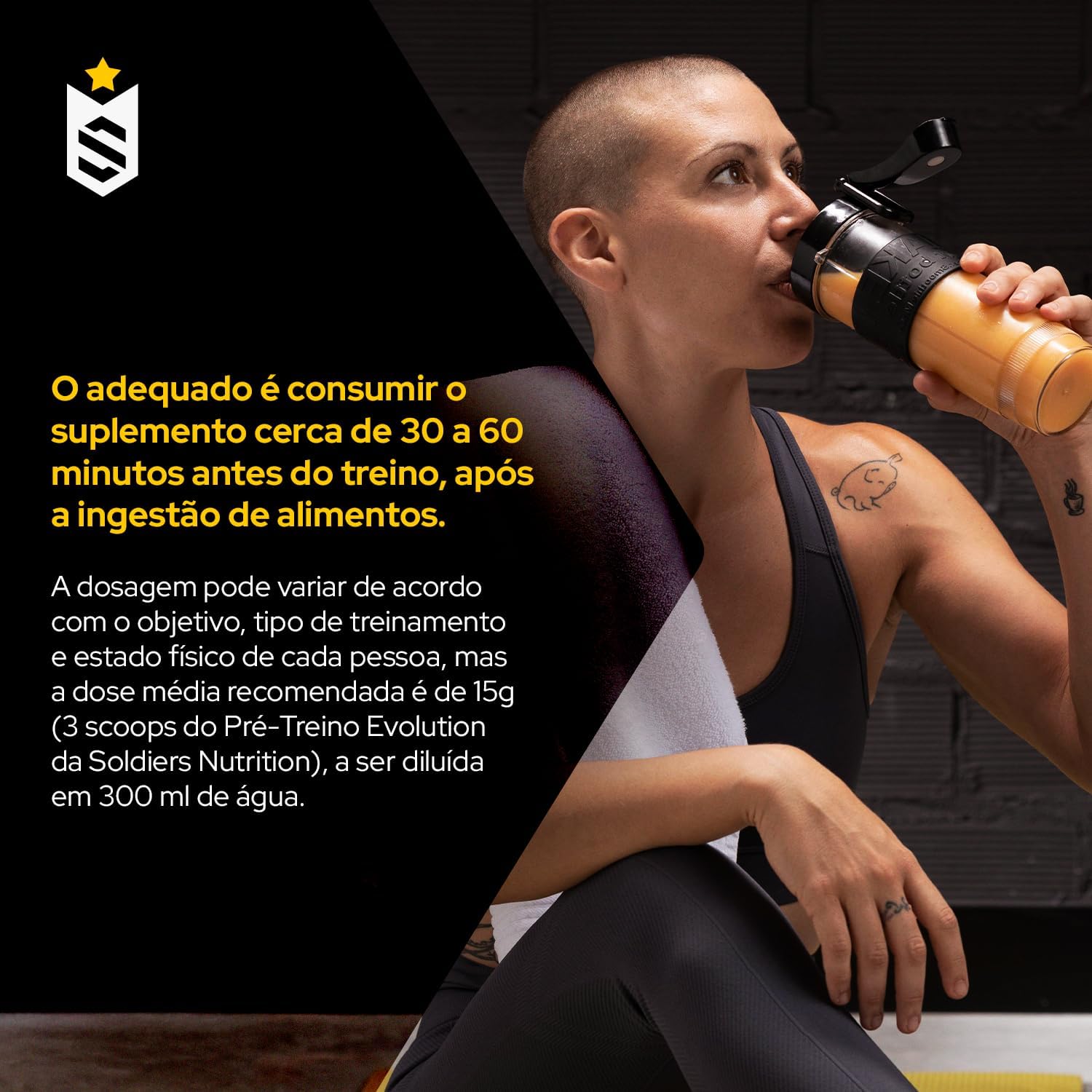 【PRÉ-TREINO REVOLUCIONÁRIO】Evolution é o pré-treino revolucionário da Soldiers Nutrition. Fórmula completa com ingredientes selecionados de alta qualidade e 100% seguros. Contém 2g de beta alanina, 2g de taurina, 1g de arginina, 1g de tirosina, 250mg de cisteína, 200mg de cafeína, vitaminas e minerais.