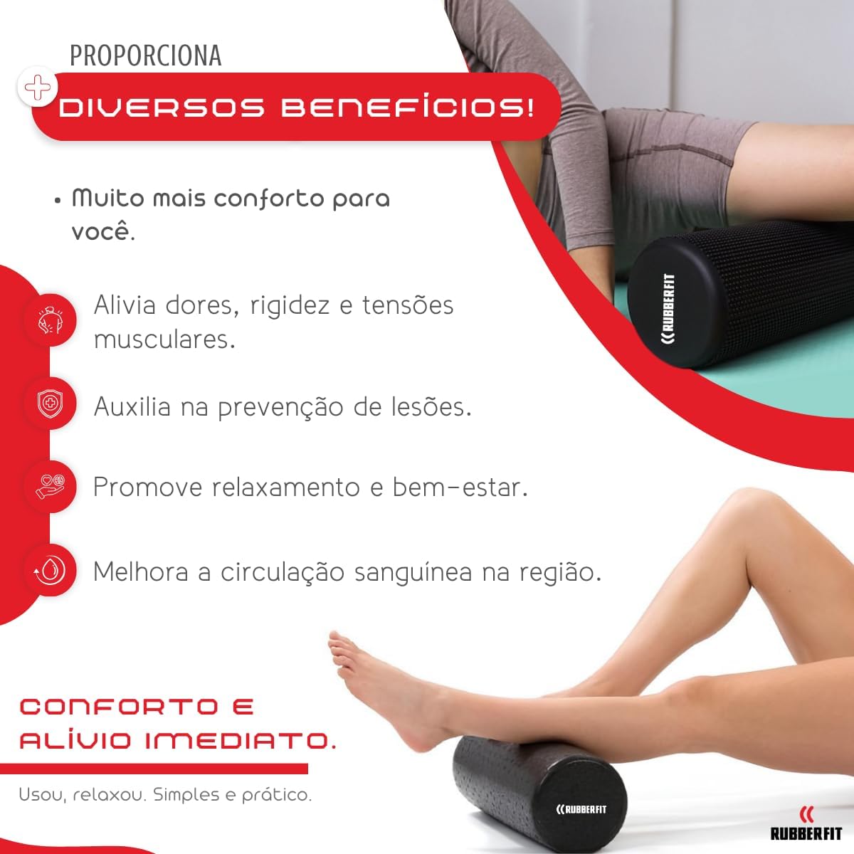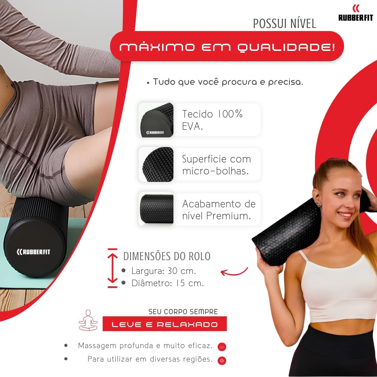 O Rolo de Massagem Rubber Fit é um acessório excelente para realizar massagens na técnica de liberação miofascial e aliviar tensões musculares, causadas por padrões de movimentos repetitivos ou fadiga muscular. Muito utilizado também antes e depois de treinos para soltar a musculatura e preparar o corpo para o fortalecimento. Produto excelente para atletas, esportistas ou praticantes de atividade físicas intensas. É sempre indicado uma massagem com o rolo de liberação miofascial após a prática de qualquer atividade física. Fabricado em PVC, que proporciona um núcleo de suporte firme e revestimento externo em EVA de alta densidade, com superfície em textura diferenciada, que oferece uma passagem profunda e toque macio. O Rolo de Massagem Roller Foam é leve e portátil, podendo ser utilizado em casa ou carregado para qualquer lugar sem dificuldades. Indicado para praticantes de yoga, pilates, crossfit e outras atividades físicas Leve e fácil de transportar e armazenar Fabricado em material resistente Marca: Rubber Fit Material: PVC e EVA Cores disponíveis: Preto e Verde. Suporta até 100kg. Inclui: 1 Rolo de Massagem Roller Foam Tamanho grande: 33cm de comprimento x 14cm de diâmetro