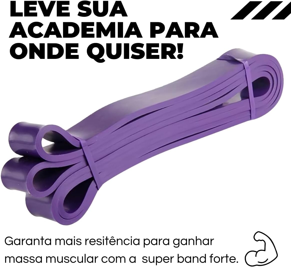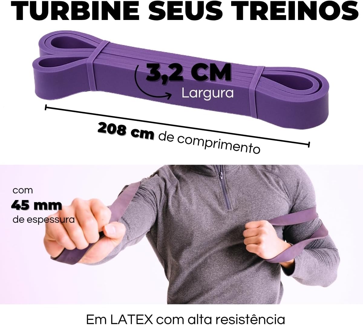 Faixa elástica roxa com resistência forte (23 a 34 kg), dimensões de 208 x 3,2 x 0,45 cm, feita de látex
